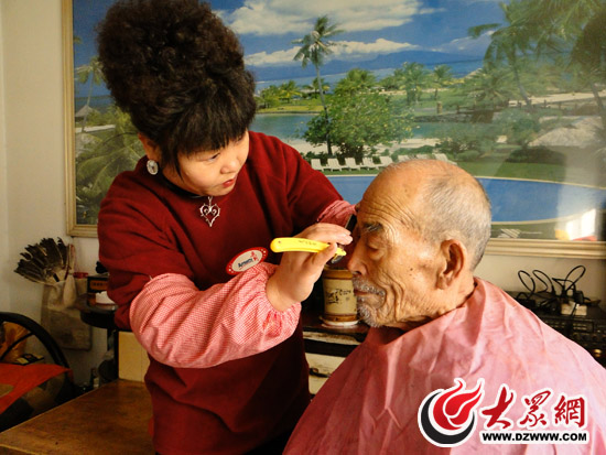 淄博安利志愿者劉曉青為老人理發(fā)刮臉