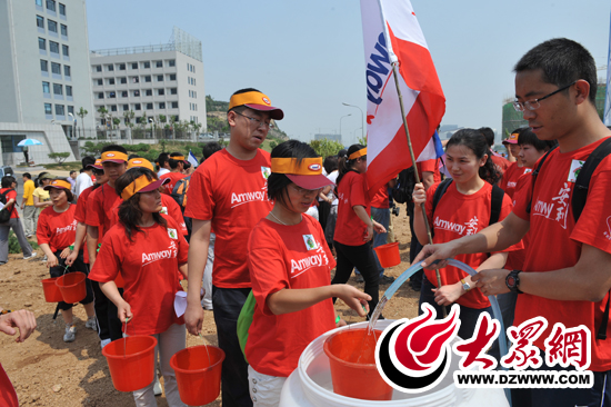 - 濟南植樹活動中,志愿者王冬幫有序排隊的志愿者們接水