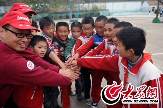 濟南仲宮穆家小學里,志愿者陶俊嶺、曹衍合在比賽前和同學們相互加油