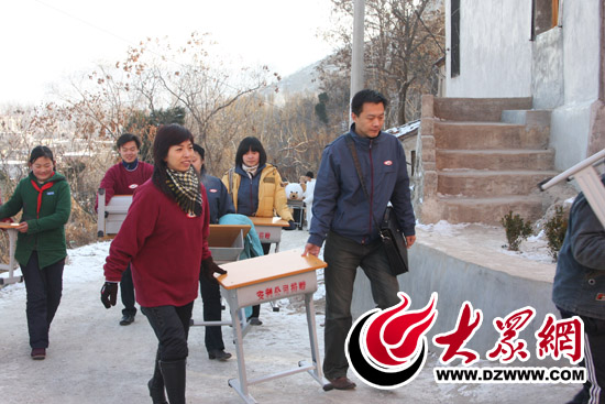 志愿者張軍(右)將公司捐獻的新課桌送到濟南劉家慈安小學