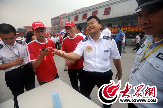 濟(jì)南長途汽車站游戲中,當(dāng)志愿者報出成績后,自信的選手向?qū)κ痔魬?zhàn)