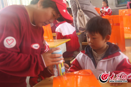 濟南仲宮穆家小學里,志愿者向小朋友們展示他們獲得的獎品