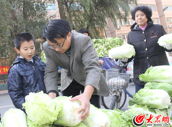 早晨10:00,第一輛“愛心白菜車”來到位于花洪路西段路南的花園小區銷售點。一看到“大眾網今冬請吃愛心菜直銷車”的橫幅,附近的居民便紛紛上前購買大白菜,你買兩棵我買三棵,你買一口袋我裝一小推車,不一會的功夫,“愛心菜直銷車”前就擠滿了前來購菜的愛心市民,其中包括早已等候多時的大眾網“奔騰車友會”的網友們。不少駕車路過的市民也趕緊停下車,擠到直銷車前“搶”上幾棵大白菜。臨到中午的時候,一車足有8000斤的大白菜已經賣了一半。