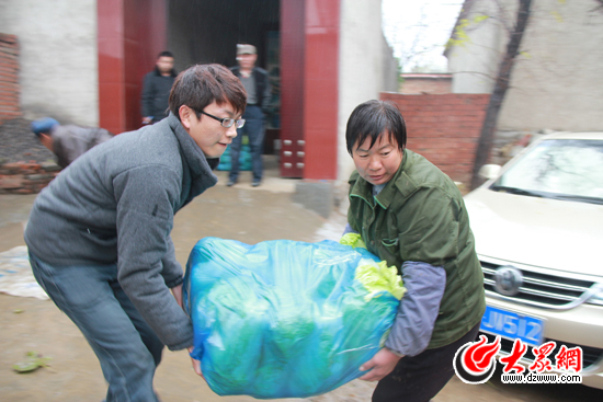 聽說愛心企業來了,唐西村村民將剛剛摘下并包裝好的新鮮白菜運出來。