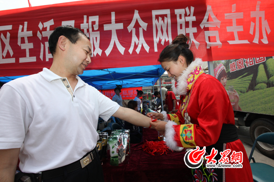 “納魯西魯!納魯西魯……”(漢語:吉祥如意)一句句貼心的羌族祝福語送給了愛心市民 ,一條條紅色的吉祥帶為他們送去誠摯的祝福。在北川茶“感恩山東之旅”第二站的現場,絡繹不絕的市民們從四面八方趕來,紛紛解囊購買北川茶,為災區企業恢復重建奉獻一點愛心。