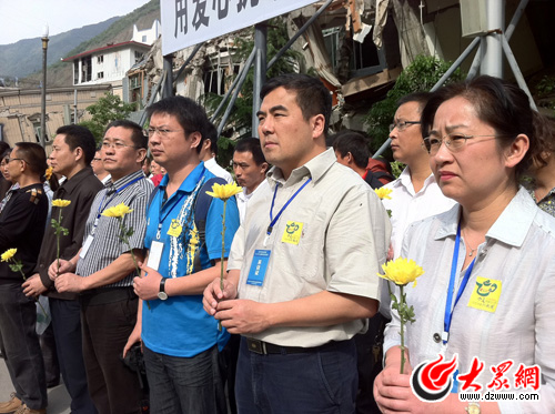 山東愛心企業代表在“5.12”大地震遇難者紀念碑前致哀。從左至右為:農業銀行山東分行題召棟、山東省體育彩票管理中心何珊、大眾網副總編姜長勇、中國建設銀行山東省分行于福貴、山東省體彩管理中心朱華品
