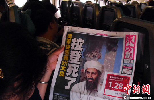 5月3日,世界各國傳媒紛紛報道本·拉登被美軍擊斃的新聞。圖為在馬尼拉飛往香港的航班上乘客閱讀有關本·拉登被美軍擊斃的新聞。中新社發(fā) 錢興強 攝