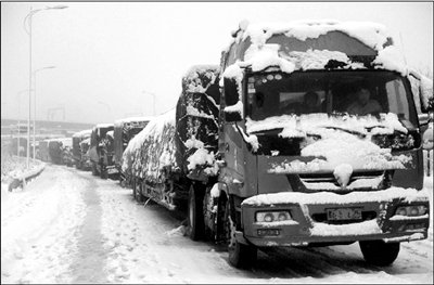 “昨晚10點我就堵在這里了,已經(jīng)8個小時沒動了!遍_往河北石家莊的貨車司機徐師傅望著夜空說,希望天亮能通車。一夜未睡的徐師傅顯得有些疲勞,但雙眼充滿希冀。