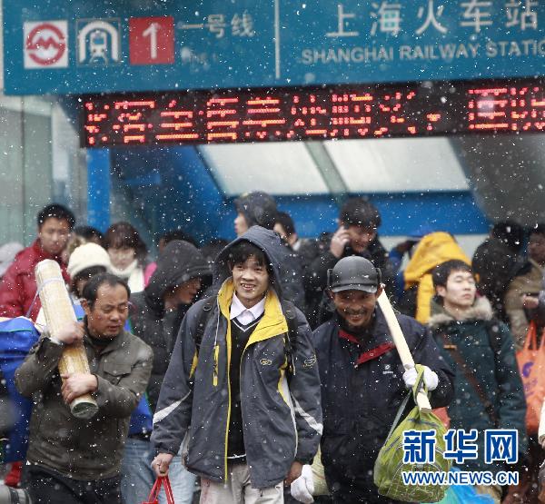 1月18日,旅客正冒雪前往上海火車站乘車。為期40天的2011年春運將于1月19日正式啟動。春運期間,全國旅客運量預計將達到28.53億人次,比上年春運增長11.6%,全國鐵路預計發送旅客2.3億人次,同比增加2554萬人次,增長12.5%。新華社記者 裴鑫攝