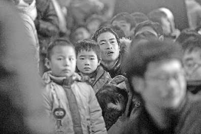17日,濟(jì)南火車站,一名男子和幾個孩子等待上車。 本報記者 王媛 攝