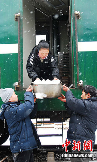 1月18日,一場(chǎng)大雪突降江西九江等地,江西贛北地區(qū)大雪紛飛,一片銀白,江西境內(nèi)的鐵路部門(mén)做好車(chē)輛防斷檢修和餐車(chē)食品供應(yīng)工作,確保人們出行安全暢通。圖為工作人員正在風(fēng)雪中往客車(chē)上運(yùn)送餐料食品。胡國(guó)林 攝