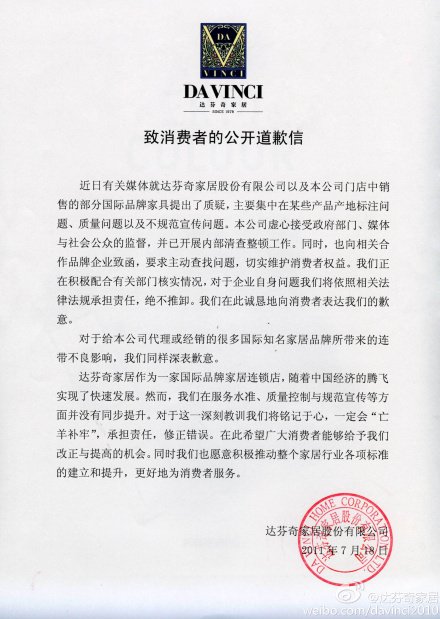 [提要] 達芬奇家居18日晚發布《致消費者的公開道歉信》,稱公司已開展內部清查整頓工作,并表示正在積極配合有關部門核實情況,將依照相關法律法規承擔責任,絕不推卸。