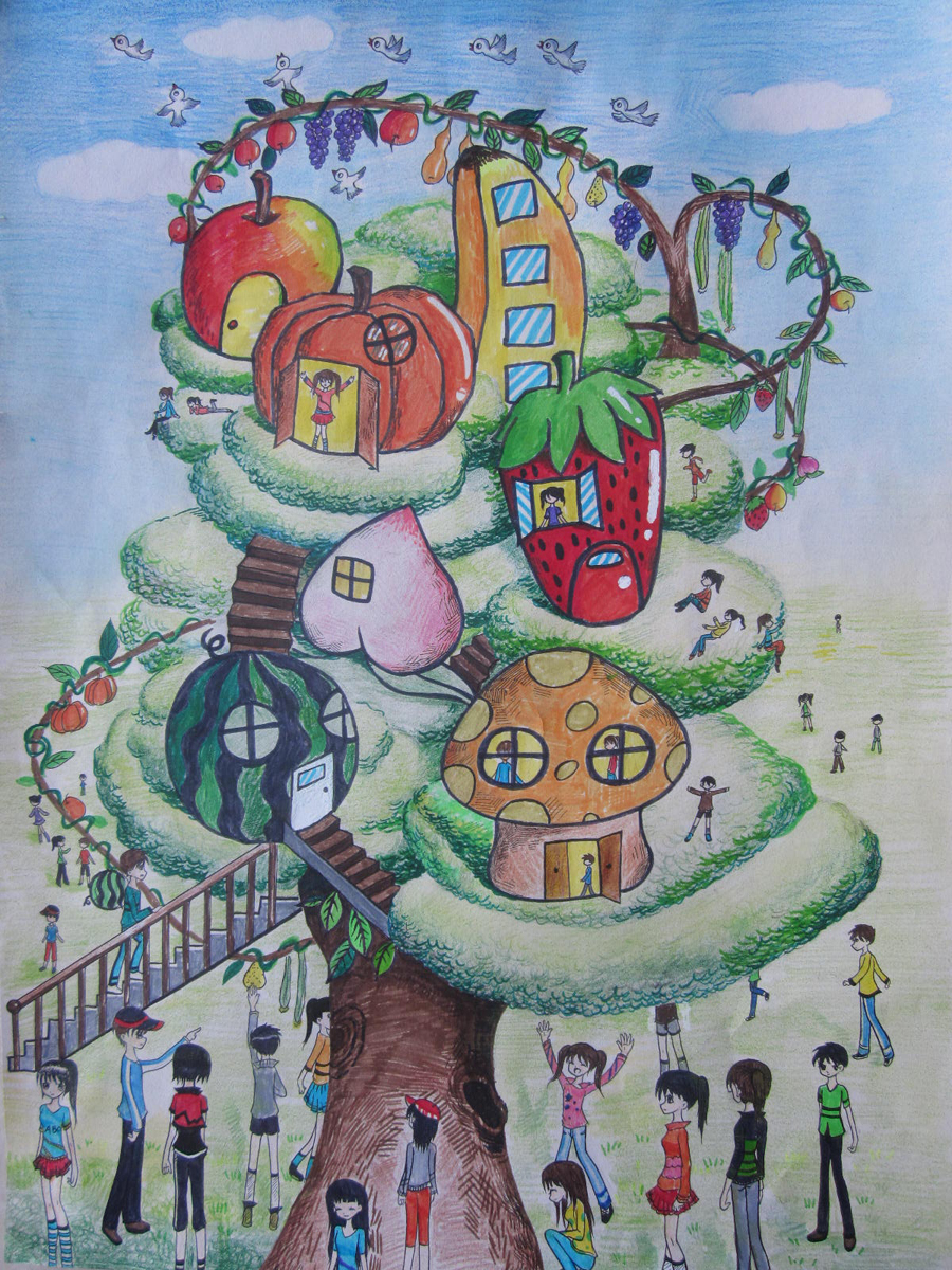 壽光是蔬菜之鄉,兩幅漫畫作品都與蔬菜有關,《空中果蔬樂園》表現了小朋友們喜歡的綠色而環保的一個果蔬公園。《一起去種菜》表現了小朋友一起去勞動,最后種植出無公害的新鮮蔬菜,體驗了勞動帶來的快樂!