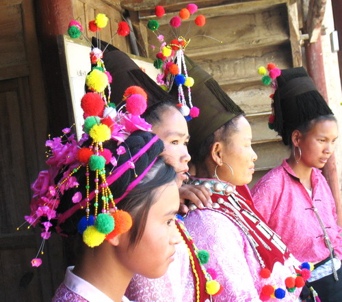 未婚婦女留長發盤辮,穿白、藍色對襟銀扣上衣,黑、藍色長褲。系繡花飄帶黑布裙。已婚婦女梳發髻,包黑布包頭,下著長筒裙,系黑布圍裙。