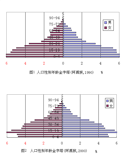 從各年齡段的人口比例看,少年兒童人口(0-14歲)比重為33.28%,勞動年齡人口(15-64歲)比重為62.45%,老年人口(65歲及以上)占4.26%,與1990年相比,少年兒童人口比重下降了6.67個百分點,勞動年齡人口比重和老年人口比重分別增加了6.41和0.26個百分點。1990年和2000年阿昌族人口的性別年齡結構如圖1和圖2所示。