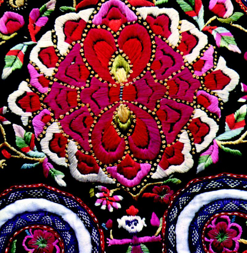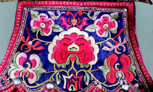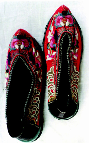 至于白族婦女的服飾,大理一帶多穿白色上衣,外套或紅或藍或黑色絲絨領褂,下著藍色寬褲,腰系綴有繡花飄帶的短圍腰,足穿繡花的“百節鞋”;臂環紐絲銀鐲,指戴琺瑯銀戒指,耳墜銀飾,上衣右衽佩著銀質的“三須”、“五須”;已婚者挽髻,未婚者垂辮于后或盤辮于頭,都纏以繡花、印花布或彩色毛巾的包頭。衣外腰帶為多層厚布縫制成硬板帶,女孩五歲起系圍,使腰身如蜂形窈窕。外系繡花飄帶的雙層短圍腰,或立或行總婀娜多姿。腳穿船形繡花鞋,表示江海無阻一生順利。鄧川一帶的未婚女子則戴小帽或滿布銀鈴的“鼓釘帽”、帽檐高翹的“魚尾帽”。居住在麗江九河的白族婦女的領褂,多為氆氌,袖、腳鑲著花邊,披著背有七星圖案的輕軟羊皮。保山阿石寨婦女所穿的對襟衣,前襟齊腰,后襟過膝,臂套彩色袖筒,前系長可及地的圍腰。碧江白族婦女的服飾,頭戴鑲有海貝和白色草子的花圈帽,頂佩十數串彩色小珠子,身穿黑色或花色短衣,腰圍前后鑲著三道海貝和珠子的繡花圍腰,赤足。大理海東新婚女子的發飾,梳“鳳點頭”(鳳頭、鳳背、鳳翅、鳳尾俱全),身著大鑲大滾的紅綠衣褲;青年婦女也戴“鼓釘帽”。
