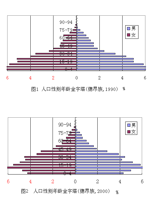 從各年齡段的人口比例看,少年兒童人口(0-14歲)比重為31.69%,勞動年齡人口(15-64歲)比重為64.11%,老年人口(65歲及以上)占4.20%,與1990年相比,少年兒童人口比重下降了9.90個百分點,勞動年齡人口比重和老年人口比重分別增加了9.89和0.01個百分點。1990年和2000年德昂族人口的性別年齡結構如圖1和圖2所示。