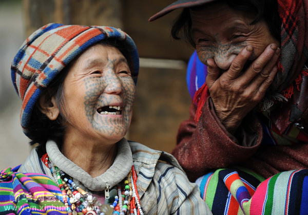 這是云南省貢山獨龍族怒族自治縣獨龍江鄉龍元村的獨龍族文面女丹吉(左)和色巴在聊天說笑。獨龍族婦女有文面的舊俗:少女12至13歲初長成時,竹簽刺臉,鍋灰敷面,顏料滲入皮下,靛青色似蝴蝶的圖案永留臉上,直到1967年這種習俗才徹底廢除。現在獨龍族文面女僅有不到40人在世(攝于5月27日)。在云南貢山獨龍族怒族自治縣獨龍江鄉的高山峽谷深處,居住著中國少小民族之一——獨龍族,總人口僅有6000人左右。新中國成立前,獨龍族還處在原始社會末期。由于當地全年有半年時間大雪封山而與世隔絕,在其余時間里也因為山高谷深、溝壑橫阻與外界交往稀疏。近年來,在各級黨委政府的扶持下,獨龍江鄉的面貌發生了巨大變化:有了第一條簡易公路,村村寨寨通了電,村民看上了電視、用上了手機,鄉里有了1所完小和5所村小學,還有了衛生院和6個村級衛生室。獨龍族群眾正在走上脫貧致富之路。新華社記者 藺以光 攝