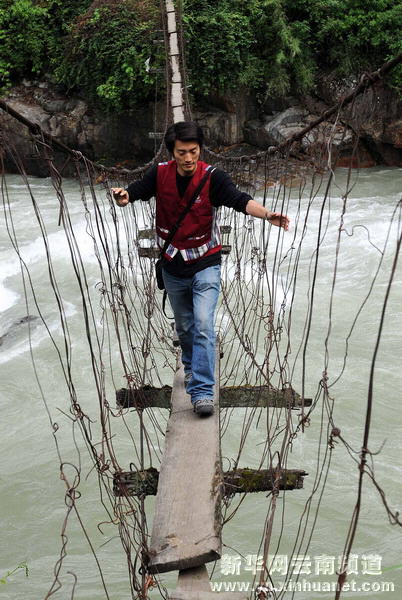 這是一名青年男子走在云南省貢山獨龍族怒族自治縣獨龍江鄉孔當村的簡易吊橋上(攝于5月28日)。在云南貢山獨龍族怒族自治縣獨龍江鄉的高山峽谷深處,居住著中國少小民族之一——獨龍族,總人口僅有6000人左右。新中國成立前,獨龍族還處在原始社會末期。由于當地全年有半年時間大雪封山而與世隔絕,在其余時間里也因為山高谷深、溝壑橫阻與外界交往稀疏。近年來,在各級黨委政府的扶持下,獨龍江鄉的面貌發生了巨大變化:有了第一條簡易公路,村村寨寨通了電,村民看上了電視、用上了手機,鄉里有了1所完小和5所村小學,還有了衛生院和6個村級衛生室。獨龍族群眾正在走上脫貧致富之路。新華社記者 藺以光 攝