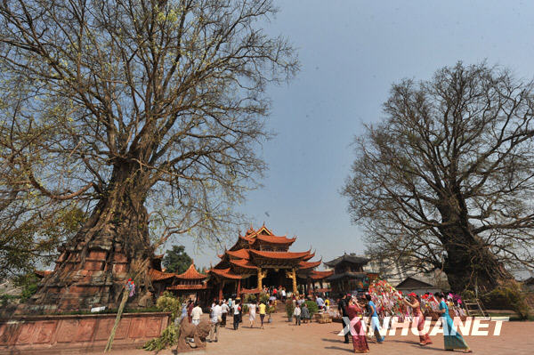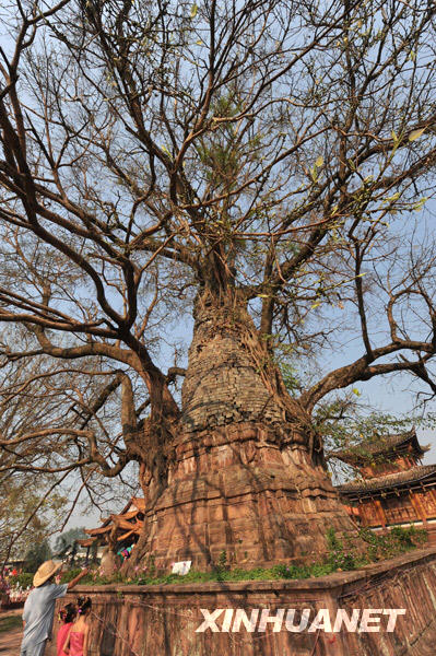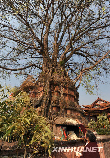 在云南省普洱市景谷傣族彝族自治縣始建于1644年(清順治元年)的勐臥總佛寺院里,有兩株已有300多歲的菩提樹。當年寺院建東西佛塔兩座,兩株菩提樹分別從雙塔上長出,日久天長,塔樹相互依存,枝繁葉茂,或塔隱樹現(xiàn),或樹藏塔出,形成“樹包塔”(傣語稱“梅赫窩廣勐”)“塔包樹”(傣語稱“廣勐赫窩梅”)的塔林雙絕奇觀。