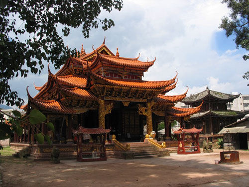 這勐臥佛寺雙塔在威遠鎮(zhèn)大寨,是昔日的官佛寺,有山門、側(cè)門、雙塔、戒堂、大殿、僧房,面積3.335公頃,雙塔在大殿兩側(cè),南北向并列。這座建筑群為明末清初(1628~1661)傣族威遠土官刀漢臣所建。清道光《威遠廳志》載:“大緬寺在威城(參將衙署)北門外,寺內(nèi)有緬僧百余人,皆剃發(fā),用黃布裹身,名緬和尚。