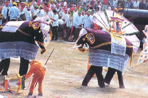 傣族群眾從各種方式來表示對象的崇拜,主要有:一、象雕塑。有佛象木雕、戰(zhàn)象木雕、家象木雕、象石雕和隨處可見的泥雕塑象。二、象織錦、象壁畫、象工藝美術品。象壁畫集中在佛寺的墻上,而最精美的藝術品要數(shù)傣族女手工織成的織綿上栩栩如生的象圖案。三、象音樂與象舞蹈。在傣族的節(jié)慶和宗教活動中,只要在群眾聚會的地方,你都能聽到一陣陣有節(jié)律的钅芒 鑼聲,都能看到象腳鼓舞和白象舞。