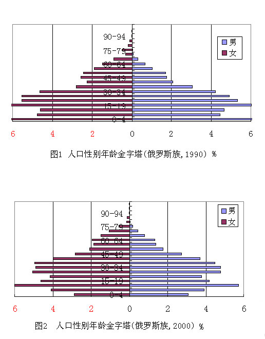 從各年齡段的人口比例看,少年兒童人口(0-14歲)比重為25.69%,勞動年齡人口(15-64歲)比重為69.44%,老年人口(65歲及以上)占4.87%,與1990年相比,少年兒童人口比重下降了5.57個百分點,勞動年齡人口比重和老年人口比重分別增加了3.20和2.37個百分點。1990年和2000年俄羅斯族人口的性別年齡結構如圖1和圖2所示。