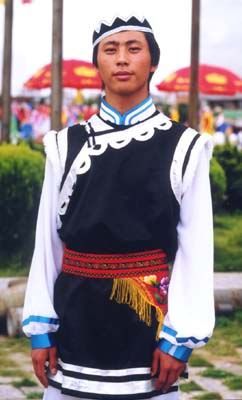 男子服飾上衣中間開口,一排整齊的布挽紐扣,領高寸許。下穿黑色或淺藍色的褲子,長齊腳踝,有的還套上黑色套褲,與漢族男子穿的褲、褂無大區別。寒冷季節,披一件不褂面子的羊皮襖,斜襟,長的與大氅長短差不多,短的與短褂相似。穿短皮襖時,多系一條粗布制的腰帶。老年人一般都內戴圍肚。