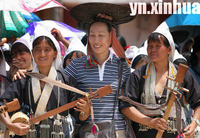 [提要] 奕車人是哈尼族的一個支系,主要分布在紅河哈尼族彝族自治州的紅河縣。一位游客(中)在哈尼族奕車人的“姑娘節”這天,與兩位奕車姑娘合影。哈尼族奕車人與游客共同觀看“姑娘節”表演。