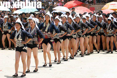 一群哈尼族奕車姑娘在“姑娘節”上進行舞蹈表演。