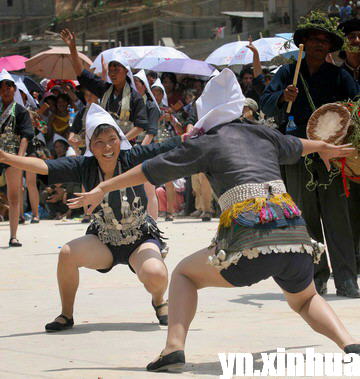 兩位哈尼族奕車姑娘在“姑娘節”表演儀式上跳舞。