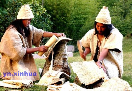 [提要] 據記載,哈尼族人穿樹皮衣約有1000年歷史。最近又恢復制成了樹皮帽、鞋、裙、褲、包等11個品種共100余件樹皮制品。張樹皮(右)與同伴一道對去漿后的樹皮進行輕捶,以增加其柔軟性。