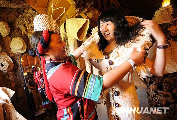 [提要] 在昆明云南民族村哈尼族寨子里,一個(gè)風(fēng)格獨(dú)特的“樹皮布展覽館”成為吸引游客的亮點(diǎn)。新華社記者秦晴攝 “張樹皮”的妻子(左)在幫助一位參觀者試穿樹皮服飾(7月29日攝)。
