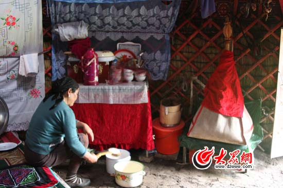 主人在為我們盛馬奶子。右邊的大皮囊裝的就是正在發(fā)酵的馬奶子。一匹馬一天可以擠8次、4斤左右馬奶,別克的妹妹家一天可擠上百斤馬奶。哈薩克人相互串門聊天喝馬奶,每天馬奶都喝得一滴不剩。