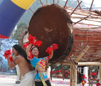 每年農歷的十二月,基諾山鮮花盛開,歡聲笑語。 寨子里的卓巴(長老)敲響了牛皮大鼓。人們情不自禁 地隨著鼓點圍著大鼓跳起粗獷的舞蹈,這就是基諾族喜慶豐收的民族舞蹈“太陽鼓舞“。