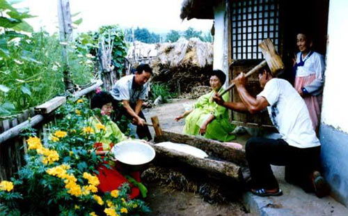 [提要] 打糕是朝鮮族著名的傳統風味食品,因為它是將蒸熟的糯米放到槽子里用木槌捶打制成,故名“打糕”。