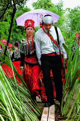 敬酒迎新娘:不論是以各種形式娶來的新娘,到了男方村寨后都不能直接進入男方家,而是先在媒人家落腳,住上一夜。據說,這樣是為了避免姑娘身上帶來的鬼魂帶到男方家。舉行婚禮前,有媒人指定兩名敬酒人,向新娘敬四次酒,敬完一次返回新郎家。第一次表示歡迎新娘的到來;第二次請新娘好好休息;第三次請吃好飯,第四次表示一切準備齊全,請新娘到新郎家。敬酒完畢,就為新娘梳妝打扮,之后由女方媒人執矛帶路,兩名伴娘相隨新娘左右,在眾人的簇擁下來到新郎家。這時,新郎則帶領一伙男女青年吹笛唱歌迎接新娘的到來。之后,這對新人來到早已準備好的婚禮儀式場地,由男方媒人宣布婚禮開始,首先讓新郎新娘互敬煙酒,之后雙方為在場的所有人敬煙、敬酒。