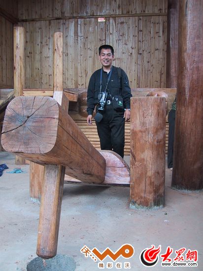 十年前的照片,施曉亮在隴川廣山景頗園的山官房前腳踩古式舂米機、背后木房上有女性乳房的雕刻。(解學來 攝)