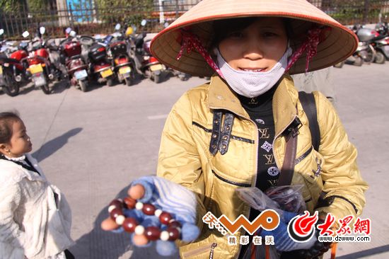 東興口岸中國境內,越南女子向記者兜售手工藝品。如今兩岸邊民來往的免稅貨物由原先的5000元已經提高為8000元。