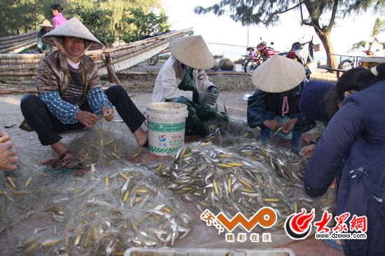 京族人靠海吃海,批發價10塊錢的沙丁魚,一天下海撒網兩次,一網就能捕到100多斤,收入不菲。