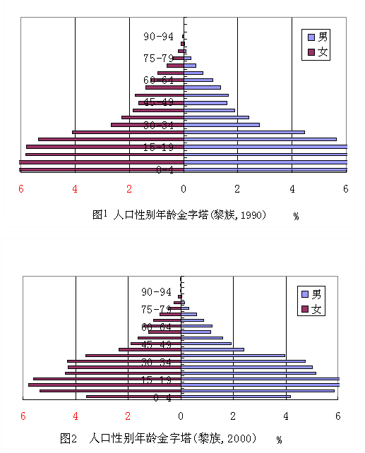 從各年齡段的人口比例看,少年兒童人口(0-14歲)比重為31.09%,勞動(dòng)年齡人口(15-64歲)比重為64.14%,老年人口(65歲及以上)占4.77%,與1990年相比,少年兒童人口比重下降了7.83個(gè)百分點(diǎn),勞動(dòng)年齡人口比重和老年人口比重分別增加了6.93和0.90個(gè)百分點(diǎn)。1990年和2000年黎族人口的性別年齡結(jié)構(gòu)如圖1和圖2所示。