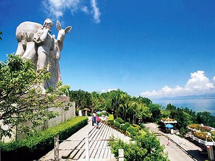 是海灘上的一座拔地而起的山嶺。在廣東海南島崖縣三亞港南5公里。這座山嶺從東北向西南伸延,然后折向西北,狀似一只金席站立海邊回頭觀(guān)望。這里有一段美麗的黎族民間傳說(shuō):古時(shí)候,五指山上住著一位勤勞勇敢、英俊善良的黎族青年,手拿弓箭追趕一只金鹿,金鹿奔逃來(lái)到海灘,面臨碧波萬(wàn)傾的大海,走投無(wú)路,它猛一回頭,變成一位美麗的黎族姑娘,對(duì)著青年微笑。兩人遂給白頭之盟,在海邊安家立業(yè)。海灘上的嶺就是金鹿的化身。