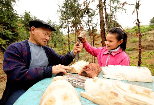 3月17日,廣西河池市環(huán)江毛南族自治縣洛陽鎮(zhèn)平源李果場大河組的毛南族藝人、75歲的方振國和孫女一起雕刻儺面具。自1984年以來,老人制作了約2000個儺面具。