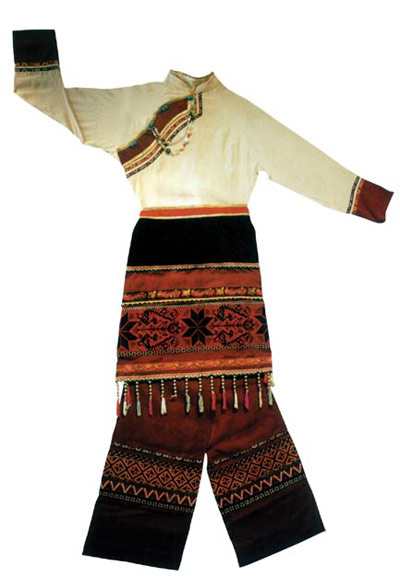 一般婦女都穿大襟上衣,長褲,在家多跣足,趕圩則穿草鞋。年老婦女腰上都束青色圍裙,系帶用黑白相間的棉線織出精致的幾何圖案,裙邊 還用抽紗擰線編成網狀花紋,樸素而雅觀。女子穿有滾邊的大襟短衣,寬身闊袖,配繡花筒裙或長褲,束青布圍裙,裙帶上織有幾何紋,喜歡佩戴各種金銀飾品。