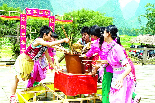 “搶糍粑”是仫佬族最興高采烈的活動,他們三人為一“冬”(組),共三“冬”人輪番用長筷子去搶放在瓦缸里的三角粽,但是三個人只能共用三只腳著地,全靠手拉手、腳扣腳在蹦跳中保持平衡,一不小心失了平衡,搶到的粽子也會掉下地。一時之間滿場喝彩吶喊和擊鼓助威聲不絕,直到缸里的粽粑搶完為止,搶得粽粑最多的一“冬”為勝者。三角粽是仫佬族依飯節的吉祥物,仫佬族人相信,誰搶得多,得“福”也越多。