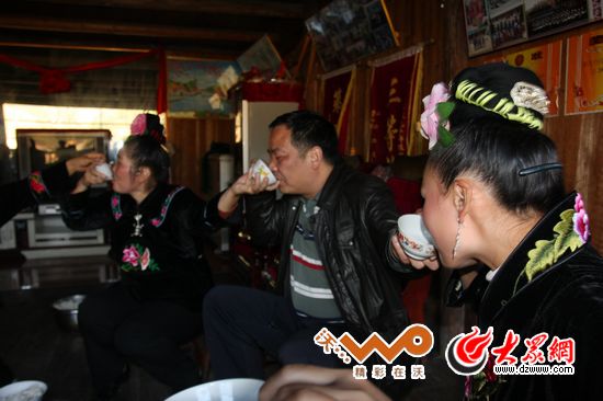 苗族飛歌之二:轉(zhuǎn)圈喝酒,先左轉(zhuǎn)一圈,再右轉(zhuǎn)一圈,同一個碗至少三個人喝過,這樣表示”我們都是朋友,我們親密無間