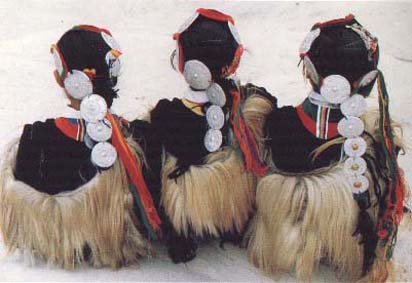 納西人較早的披肩上,在羊皮頸的上部左右對稱各綴著一個直徑約五寸的圓盤,圓盤上用彩色絲線繡有各種圖案。在羊皮頸的下部,綴有七盤直徑約三寸,仍繡有彩色圖案的小圓盤飾物,每一小圓盤的中心各吊兩面三刀條麂皮細線,共有十四條,稱“優軛崩”,即羊皮須。