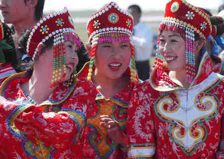 男方陪禮人先道:“貴方的少女我方的郎,千里姻緣系雙方。選擇這良辰吉日,我們將微薄的察恩特獻上。山間的幼松稚柏,今已挺拔健壯,英俊美麗的少男少女,都已長大而且年貌相當。為祝賀兩家美好的親事,我把喜酒斟滿舉起,光臨的眾族胞和親戚,請接受這虔誠的心意”。