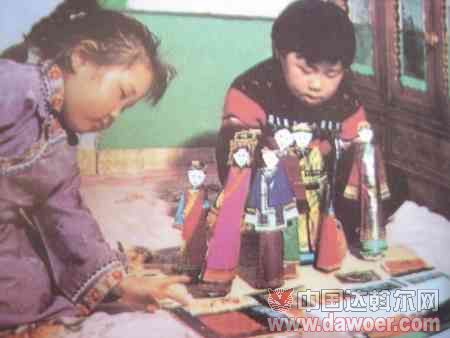 達斡爾族女孩玩“過家家”,用紙做房子,房子里面用紙做炕,樺樹皮做的小搖車,最有趣的是“哈尼卡”——紙做的玩具娃娃。大個的當長輩,小的當子孫。孩子們一邊擺放著紙做的娃娃,一邊講著假設的生活情景。“過家家”不但增長孩子的生活知識,而且培養她們的想象能力和表達能力,是一種對兒童十分有益的民間游戲。
