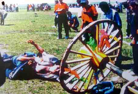 [提要] 馱背,達斡爾語稱為“特莫阿特貝”,即像駱駝一樣馱物之意。參賽運動員要將衣袖、褲腿挽好或穿運動衣以防絆腿,然后平臥在平地上。